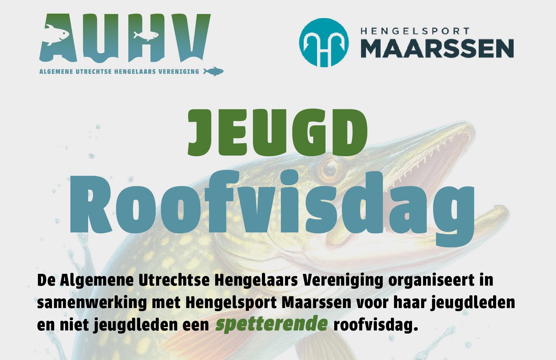 De AUHV organiseert in samenwerking met Hengelsport Maarssen voor haar jeugdleden en niet jeugdleden een SPETTERENDE roofvisdag. Ontdek waar je moet vissen, hoe je vist