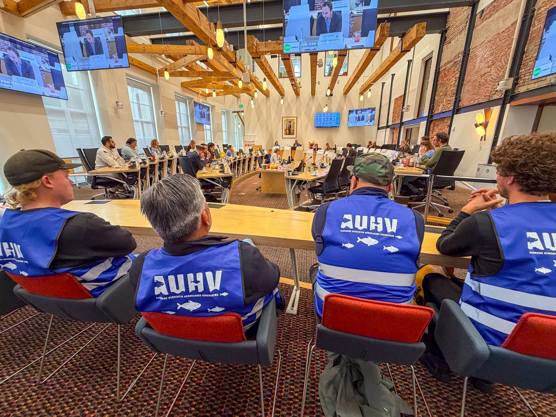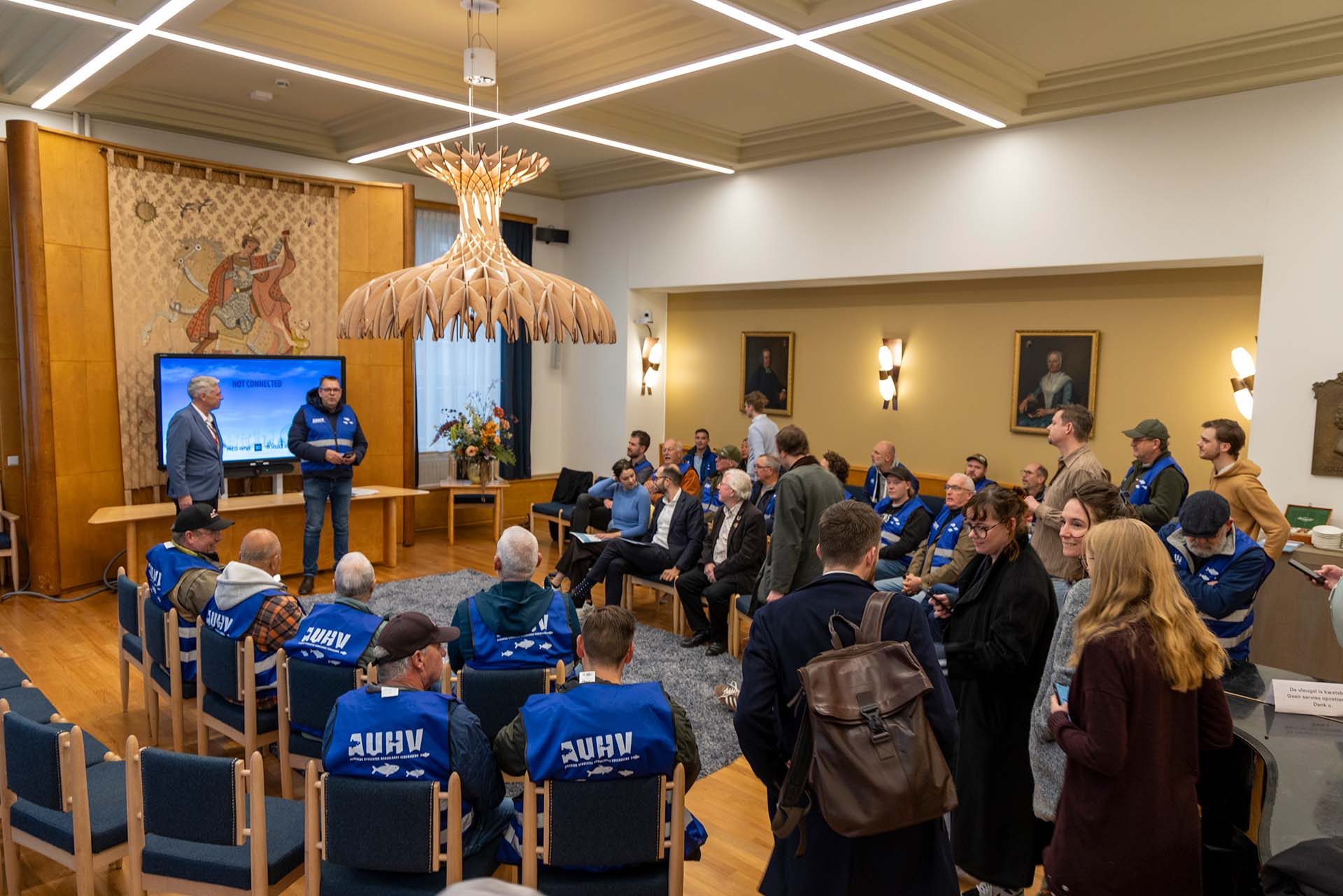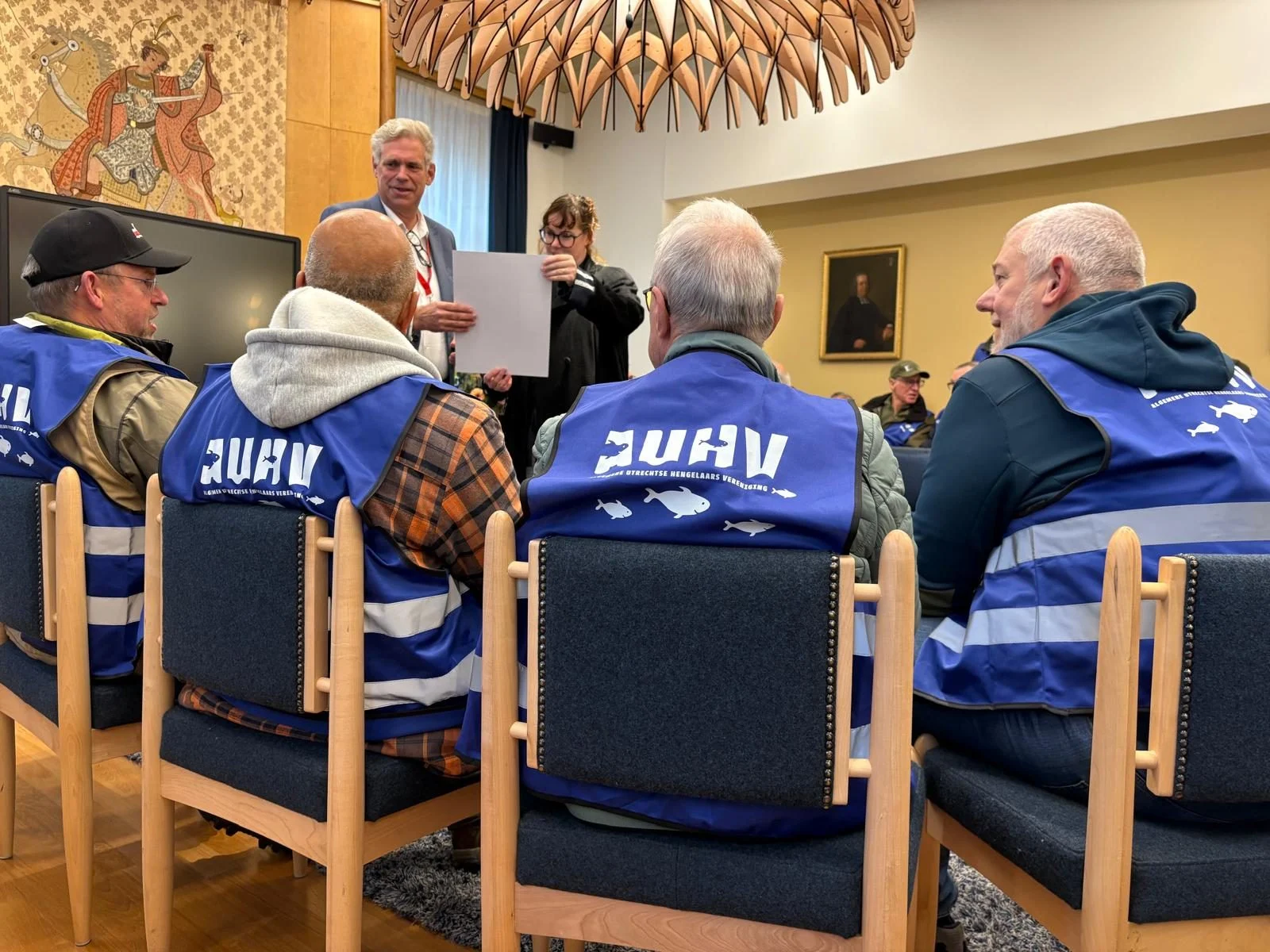 Zo’n 40 sportvissers en leden van de AUHV waren donderdagmorgen 6 november aanwezig bij de commissievergadering in het stadhuis die het beruchte voorstel van de PvdD behandelde. Voordat de vergadering begon, overhandigde voorzitter Pieter Tilroe een manifest van de AUHV over de standpunten van de sportvissers aan voorzitter Cees Bos van de commissie.