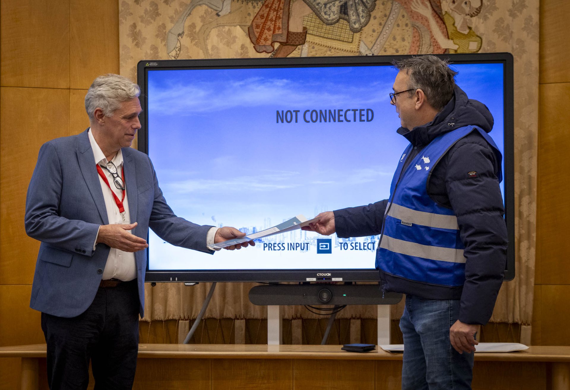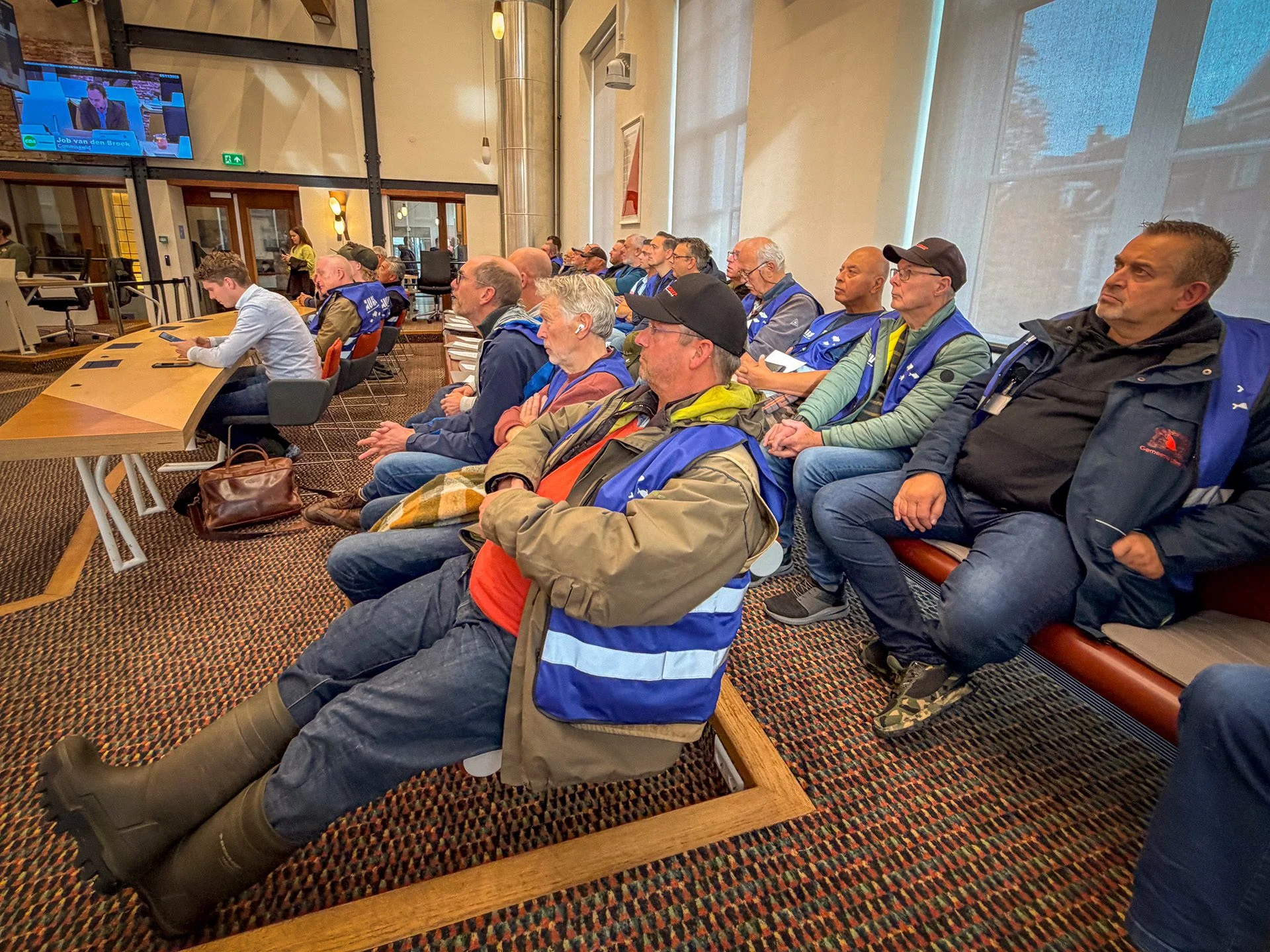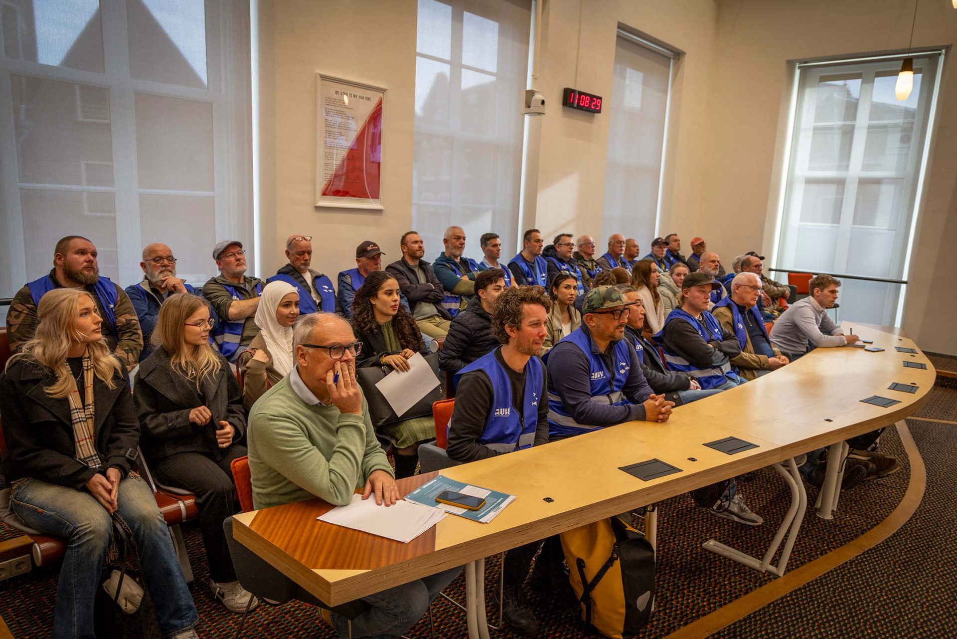 Zo’n 40 sportvissers en leden van de AUHV waren donderdagmorgen 6 november aanwezig bij de commissievergadering in het stadhuis die het beruchte voorstel van de PvdD behandelde. Voordat de vergadering begon, overhandigde voorzitter Pieter Tilroe een manifest van de AUHV over de standpunten van de sportvissers aan voorzitter Cees Bos van de commissie.