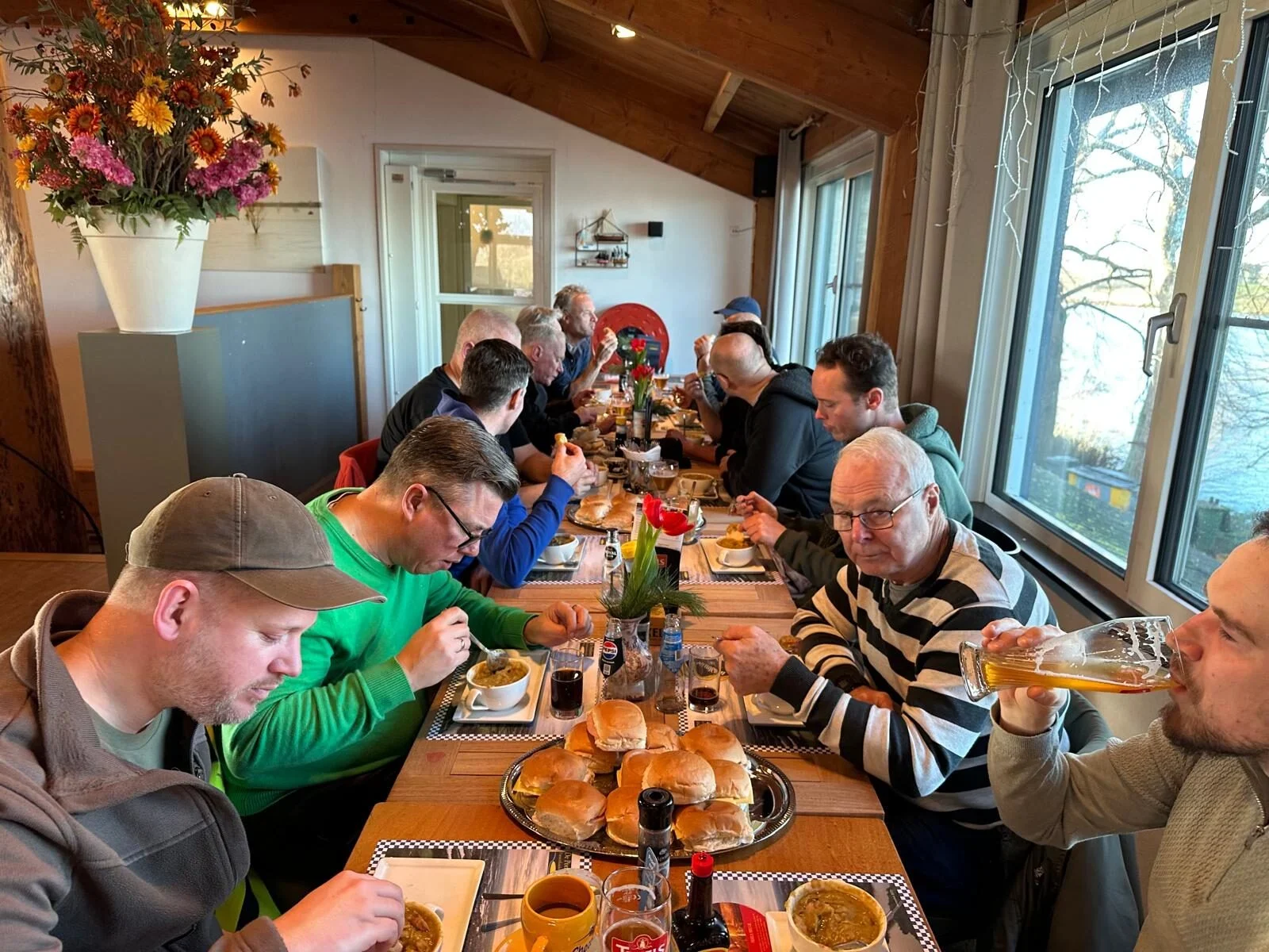 Toen de gemoederen weer wat bedaard waren en de soep op, zijn we maar weer gaan vissen. Helaas bleef het taai de rest van de middag. De groep van Mark, Bas en Ron, inmiddels versterkt met Marco trok naar Noord IJsselstein waar ‘nog een tachtiger moest liggen’. Helaas was die inmiddels gekrompen tot een kleine vijftiger, maar hé, vis is vis! Daarna werd het stil, gelukkig inmiddels wel met een zonnetje. Aan het einde van de dag nog een aanbeet, maar dat was het dan ook voor hen.