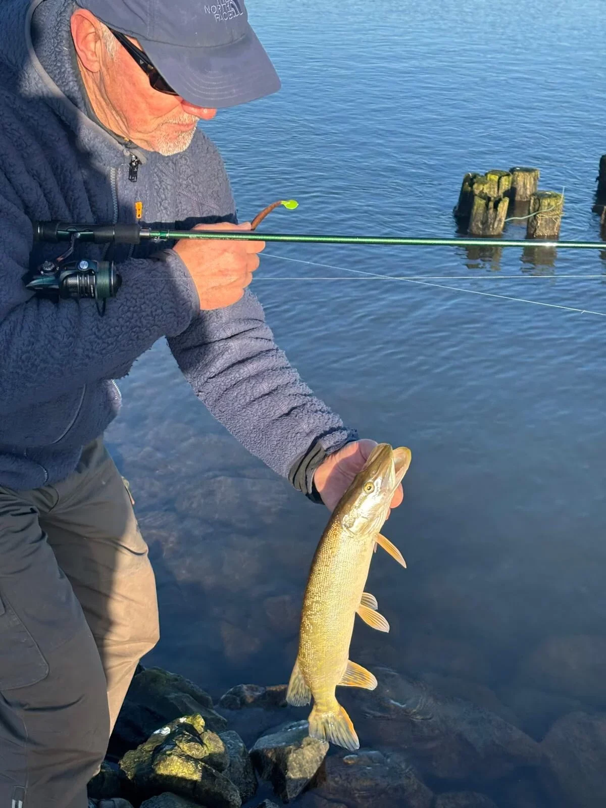 Robin en Robbert-Jan begonnen op de steiger van het pontje. Omdat de Lek behoorlijk stroomde, besloten ze met shads met 18 grams koppen vér stroomopwaarts gooien. Tegen de tijd dat je dan de bodem voelt, passeert de shad en kun je ‘m met geduld tegen de stroom in terug vissen. Helaas leverde dat geen vis op. Robin probeerde het nog met een dropshot in de monding van de haven en rond de pontsteiger , maar ook dat had geen succes. Inmiddels was de pont weer in de vaart om aan zijn dienst regeling te beginnen en we zijn dus ook meteen van de steiger afgegaan.Marco en Arno startten op de krib tegenover het pontje. Aangekomen op de krib naast het maakten ze hun spullen gereed om te vissen. Arno begon eerst met een jig, alleen bij het naar beneden klauteren gleed verloor hij zijn balans en zat dus met zijn billen op de keien. Tja, da’s het risico van kribben: altijd oppassen, ze zijn glad en ongelijk! Eenmaal opgestaan deed hij een poging zijn aas uit te gooien en floep daar ging zijn aasje! Bij het binnenhalen was blijkbaar de lijn gebroken en was hij zijn aasje kwijt. Ok, kan gebeuren, hoort erbij. Hij pakte zijn andere hengel met een gloednieuwe Westin Twitchbait en wierp die in. Maar waarom wilde zijn lijn niet strak staan? Tot zijn verbijstering was het lusje van de fluorocarbon onderlijn van de quicksnap afgesprongen. Daar ging dus aasje nummer twee. Arno ging nog even door met een andere twitchbait, maar helaas ook dat bleef zonder succes. Vervolgens heeft hij er een dropshot eraan gehangen. Maar ook nu weer: twee worpen en vast! Ondanks dat hij met de top van z’n hengel boven het plaats delict zat, kwam het niet meer goed… Dus ook een hele dropshotset kwijt.